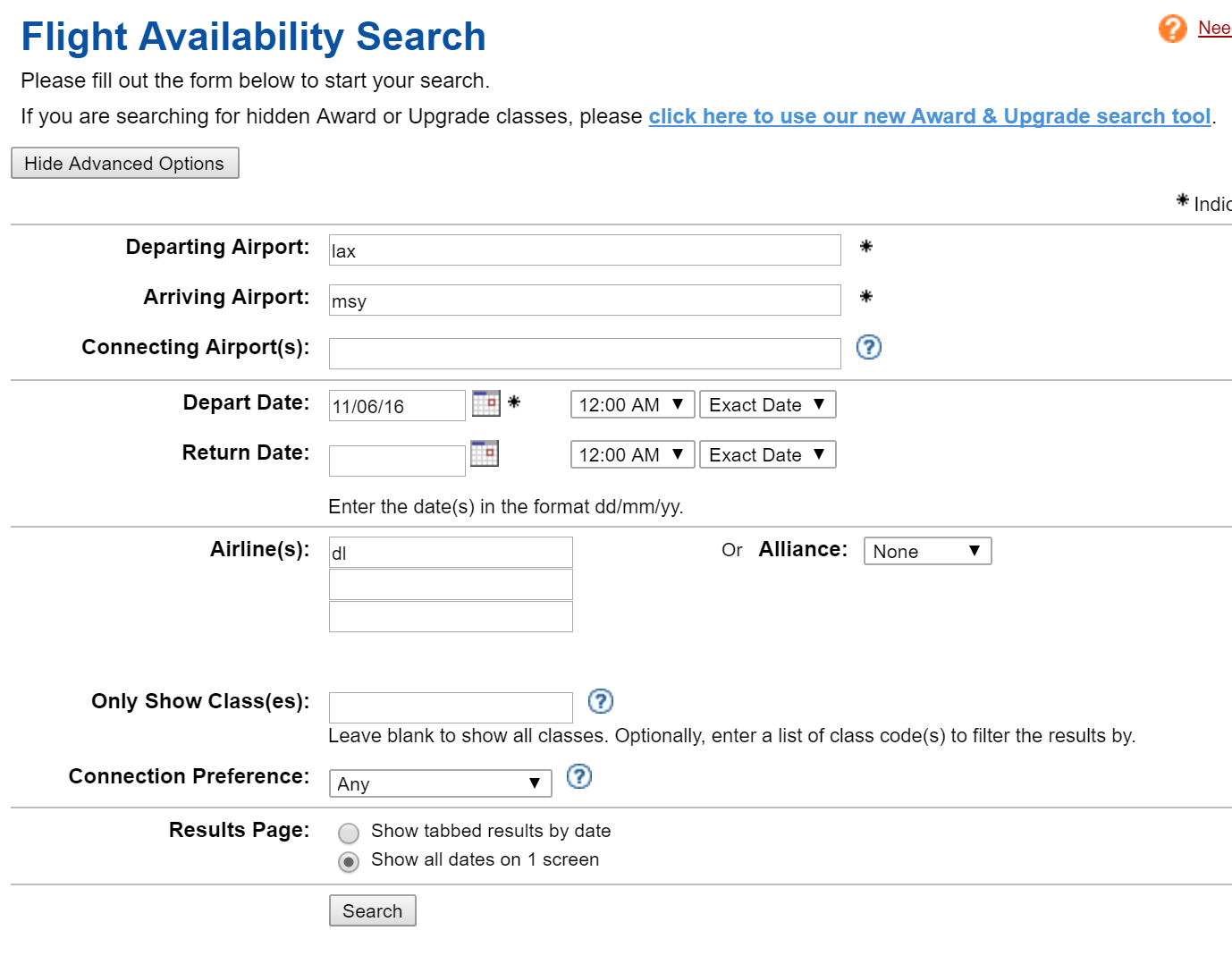 To perform a test I decided to do a search on a route I know they fly - Los Angeles to New Orleans.