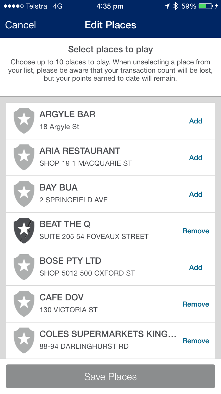 If you click Edit Places you can add up to 10 merchants that you’d like to “Play” at. If you remove a merchant and add it again in the future your transaction count will be reset, so remember this.