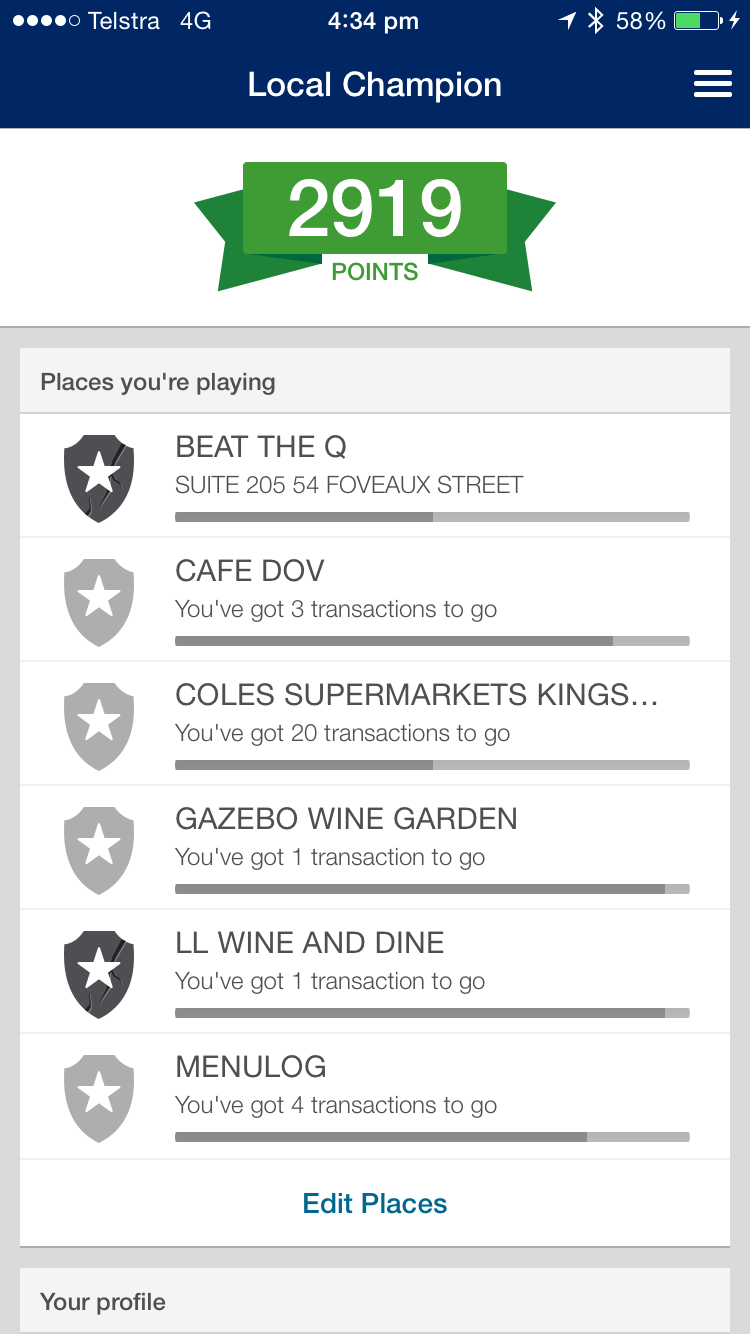 The purpose of the game is to be the local with the most number of transactions at a merchant so once you have this you will see that you’re the “Local Champion” for that merchant. Once this status is gained you will automatically receive a bonus point at each merchant on your Membership Rewards statement such as this transaction at a local restaurant.